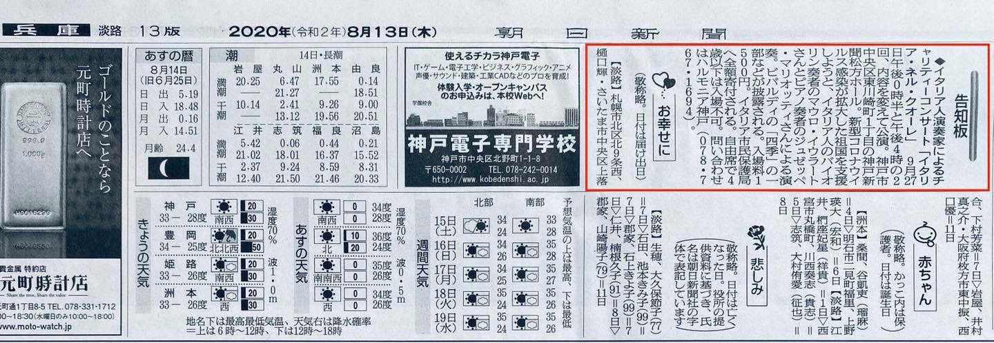 2020年8月13日朝日新聞朝刊13面「告知板」に、9月27日開催チャリティーコンサート情報が掲載されました。お申込はハルモニアKOBE事務局 ticket@harmonia-kobe.com / 078-767-1694 までお待ちしております。