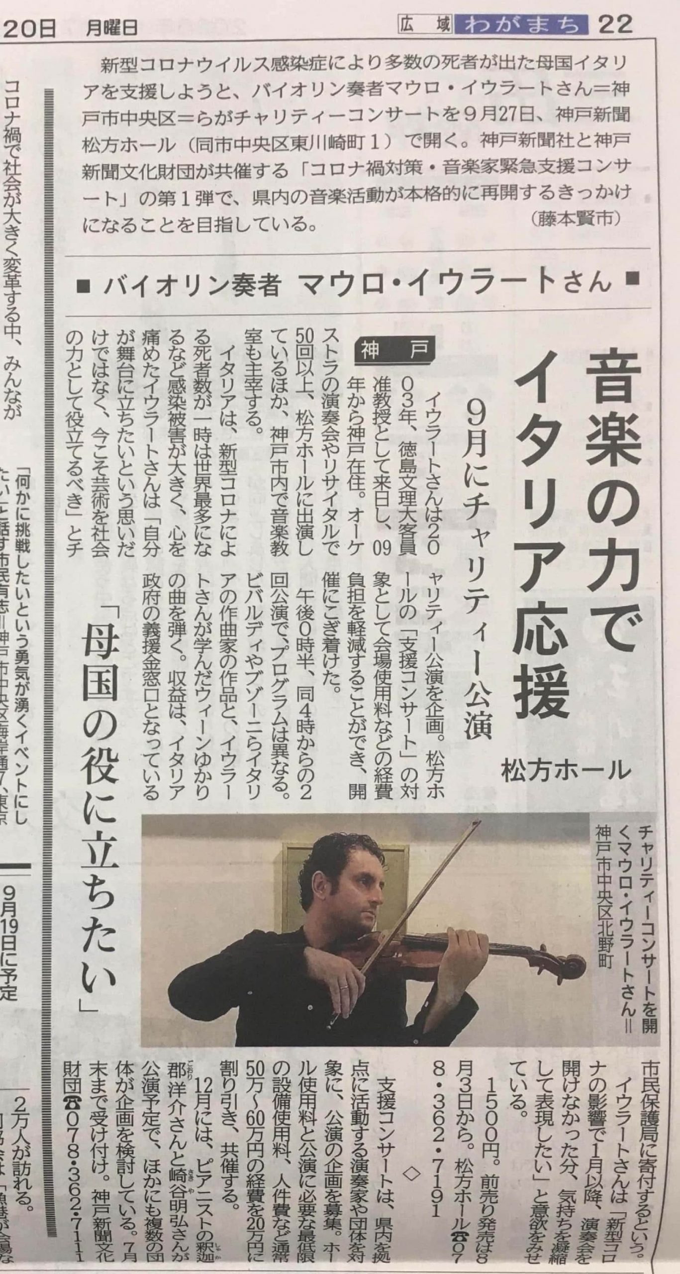 2020年7月20日神戸新聞朝刊22面「わがまち」に、コンサート情報が掲載されました。新型コロナウイルス感染症でより多くの被害に遭われたイウラートの祖国イタリアへのチャリティーコンサートです。お申込はハルモニアKOBE事務局 ticket@harmonia-kobe.com までお待ちしております。