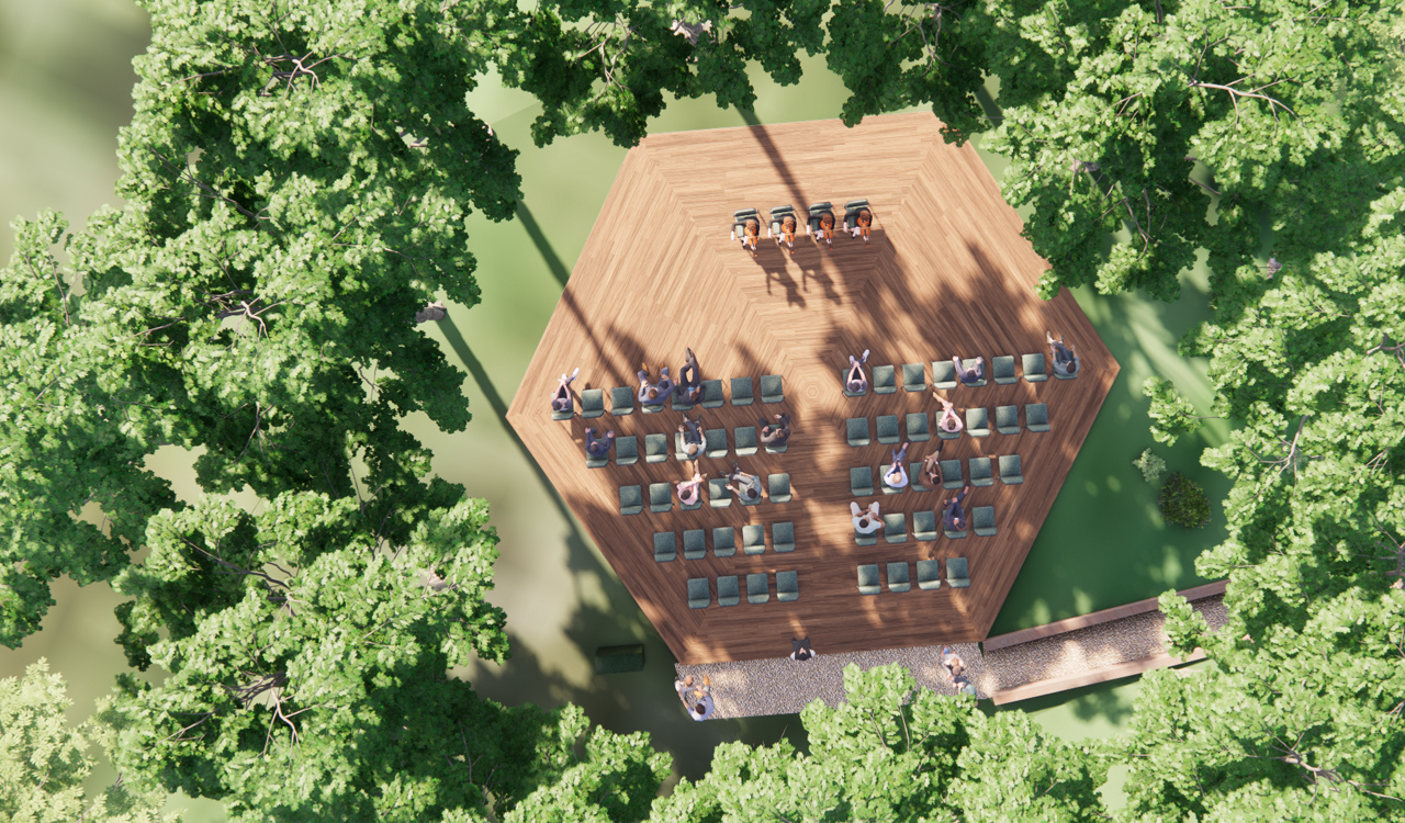 六角形に作られたこのステージは、クラシック音楽のコンサートからフィットネスやヨガのクラス、マーケットや野外パーティーまで、さまざまなイベントを開催することができます。