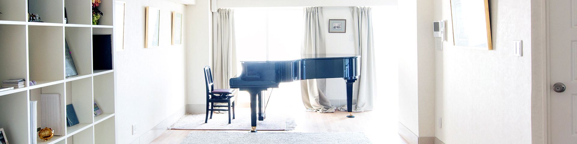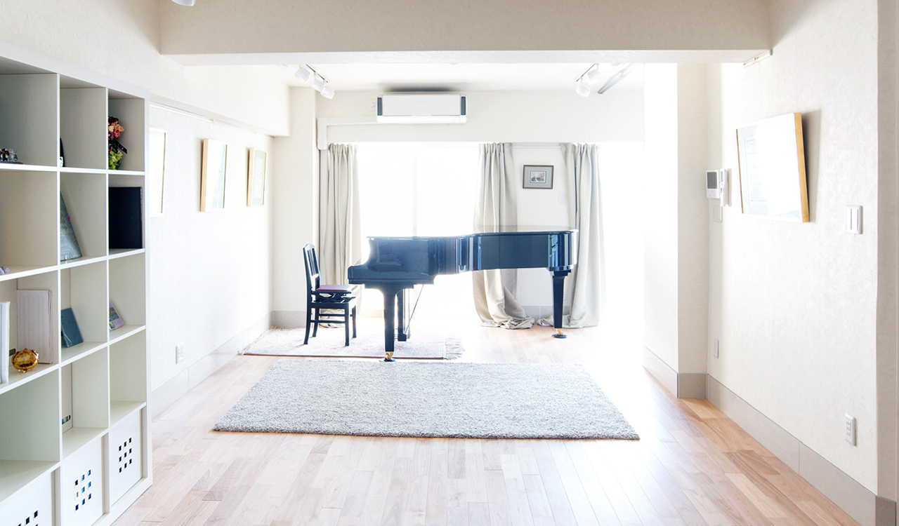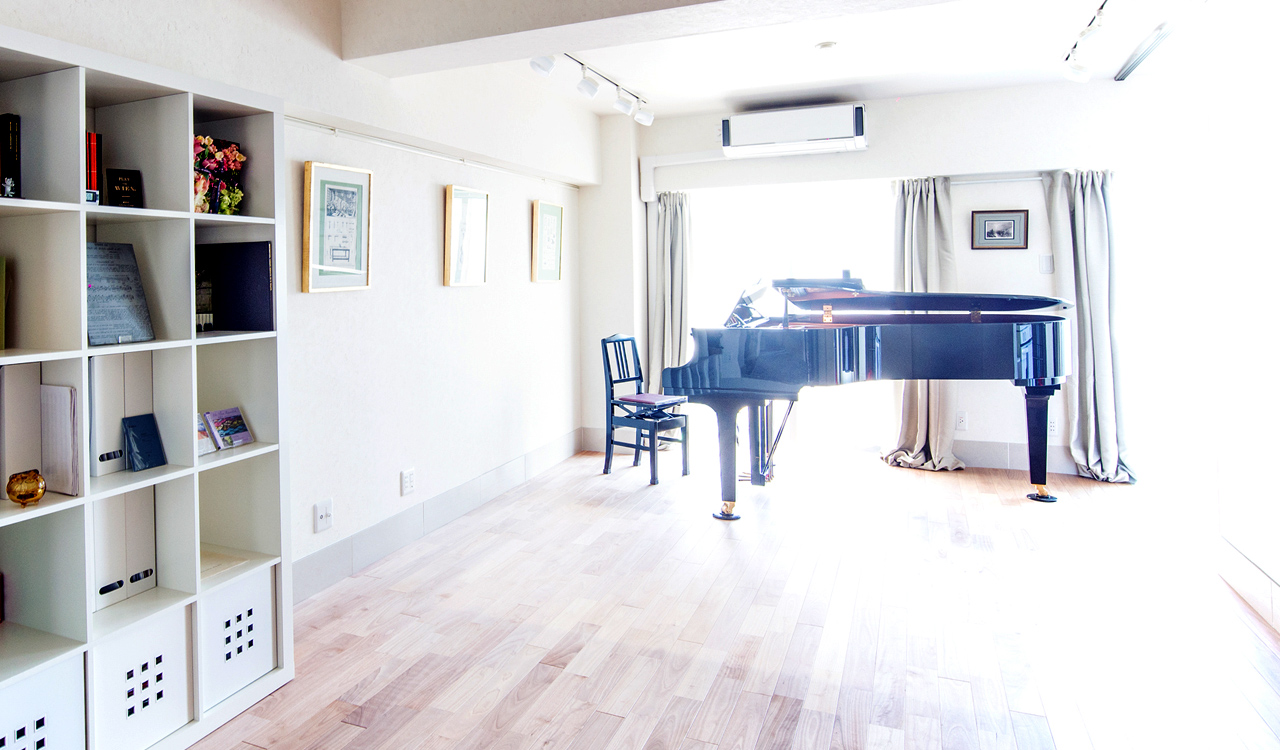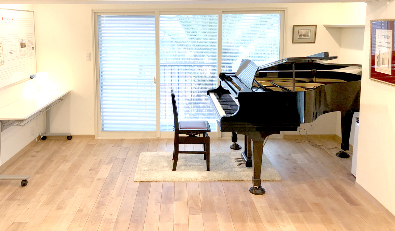 カワイのグランドピアノ(C3サイズ)を備え、各種教室や講座のためのホワイトボードを壁に設置しています。